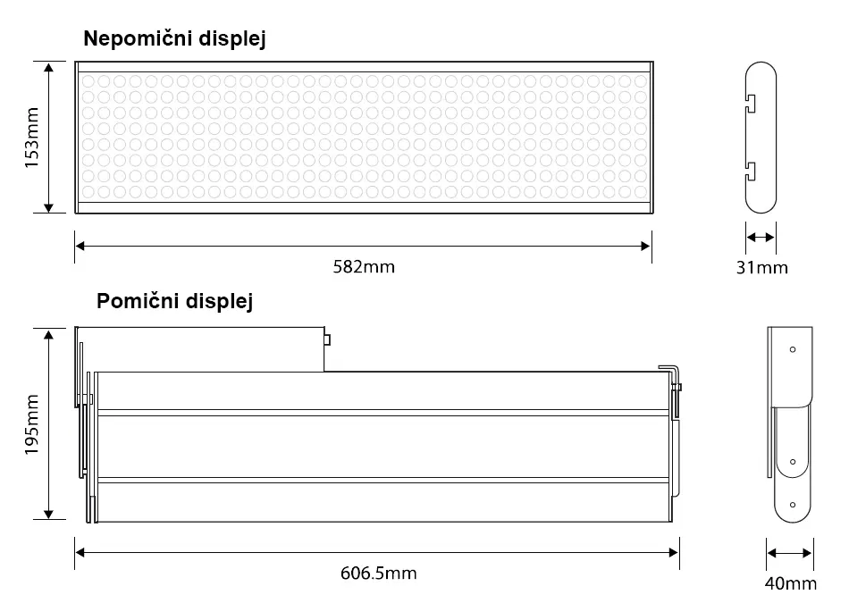 606.5mm x 195mm x 40mm (pomični displej)